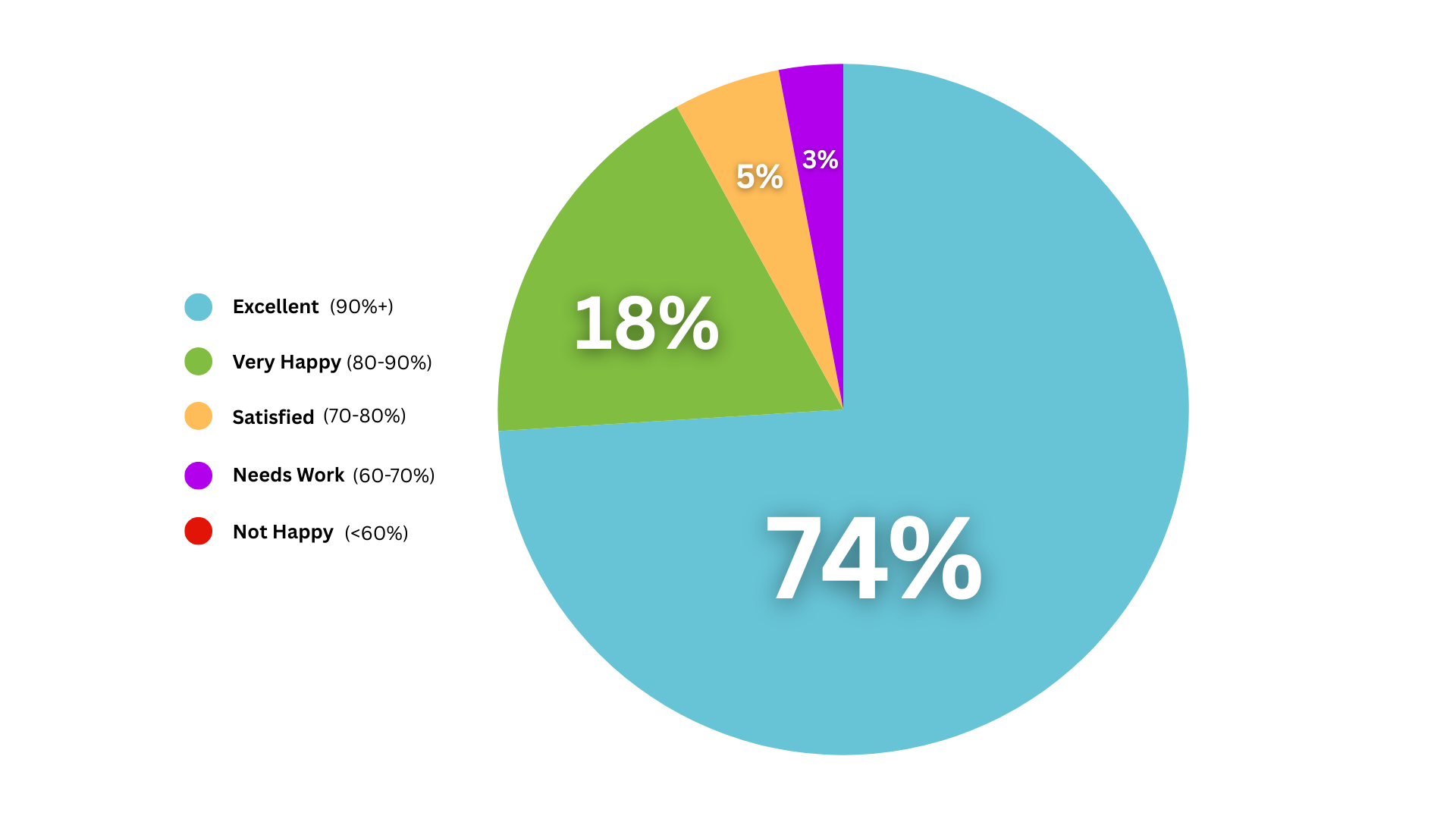 We’re proud to report that 74% of clients rated us as ‘Excellent’, with another 18% saying they’re ‘Very Happy’. And the best part? Our pie chart is full of blue and green, with no red in sight! Once again, we have zero unhappy clients, which is what we strive for.