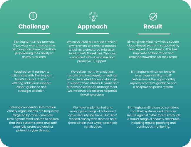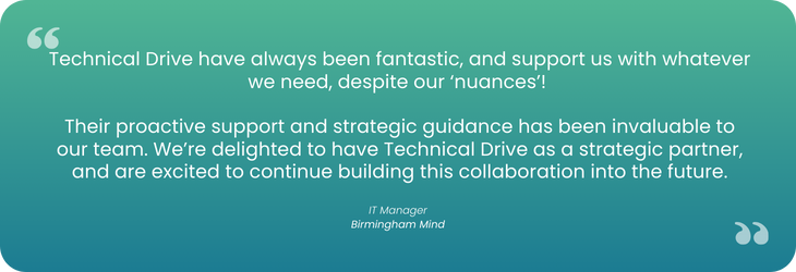 Technical Drive’s support ensures Birmingham Mind’s team can focus on delivering exceptional care and support, while we manage their IT infrastructure and strategy.